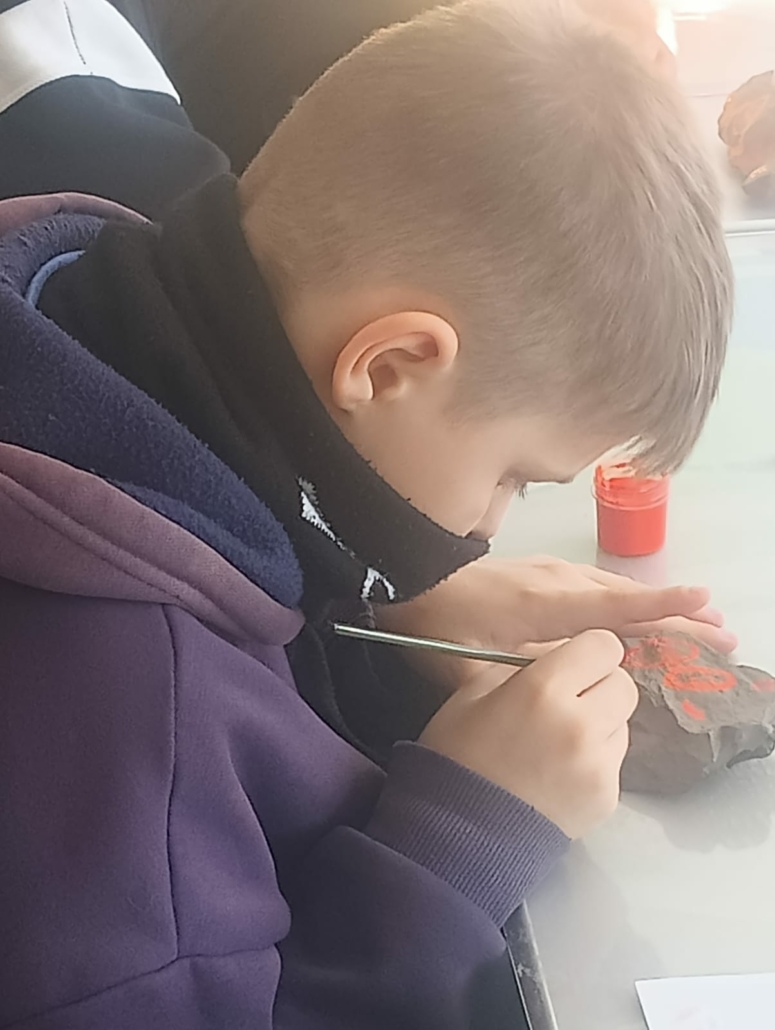 Затем ребята окунулись с интересом в творческую работу рисования петроглифов на камнях. Им очень понравился мастер-класс, дети попробовали себя в качестве «древних людей», рисуя на камнях. Многих заинтересовал этот факт, и они «загорелись» идеей, когда – нибудь посетить эти места.